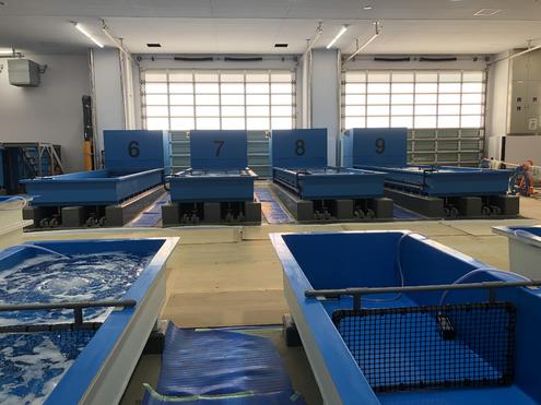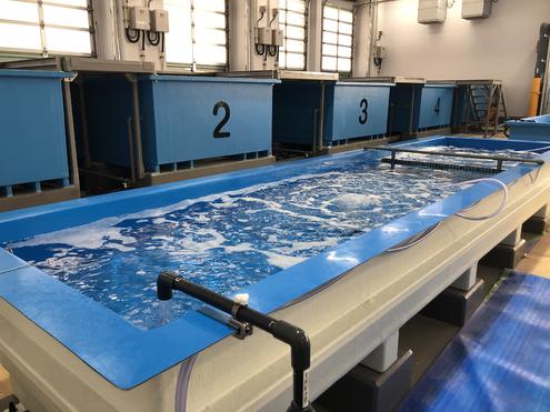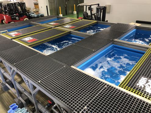 このたび、山口県下関漁港整備事業の一環として、活魚流通のストック施設が竣工しました。22基の水槽、総水量100トンの基地となります。