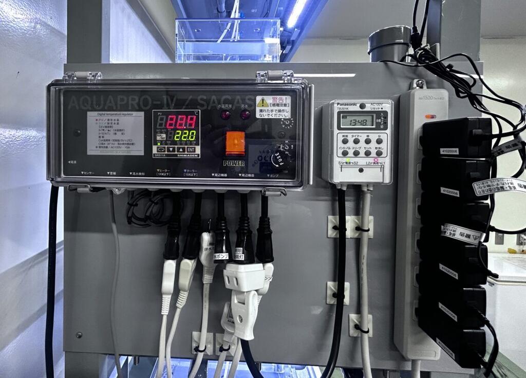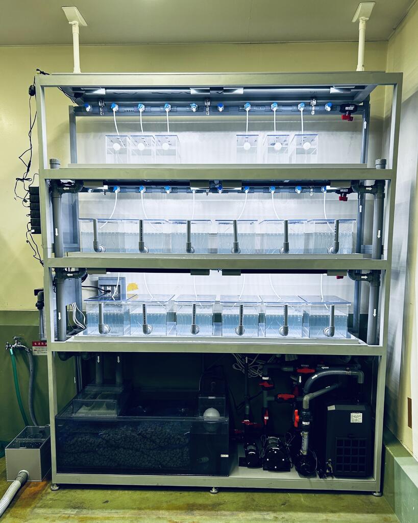 バイオ研究に適した小型水槽システムです。 この設備は、カエルによる遺伝子研究目的で使用されます。 用途目的に応じた幅広い研究ニーズに合わせた設計製造が可能です。 大学研究室 ユニットサイズ:W1800×D600×H2000H 水槽3段+LSS機器1段 100V仕様